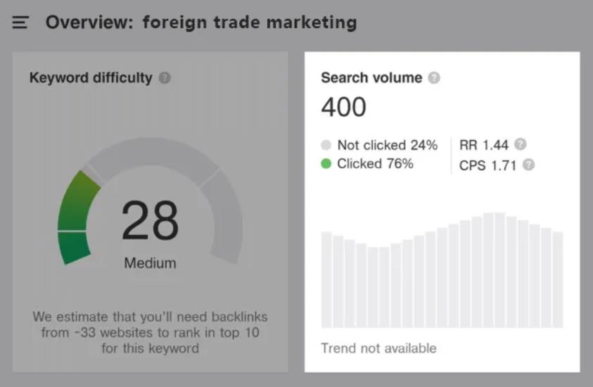 例如,关键词外贸营销(Foreign trade marketing)。根据Ahrefs,这个关键字每个月要被搜索400次。