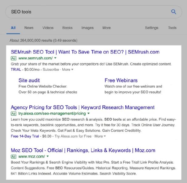 如果你在首页上看到很多东西(比如一个特色摘要和多个谷歌广告),那么你就知道可能不会得到很多点击,即使你SEO排名第一。