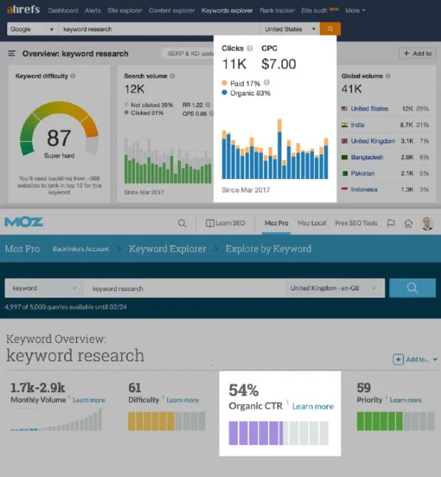 Ahrefs和Moz Pro这两个工具就可以估计自然点击。