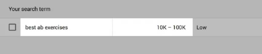 原理很简单,搜索关键词的人越多,你从中获得的流量就越多。那什么是“好的”搜索量?答案是:不同行业之间的搜索量差异很大。例如,在fitness行业中的一个长尾关键词(best ab exercises)每个月得到10K-100K的搜索量: