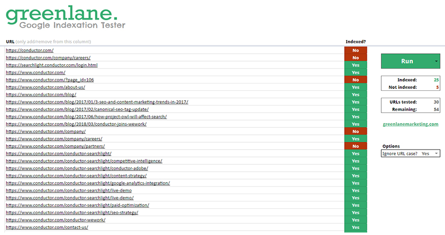 GREENLANE MARKETING公司创造了一个很棒的工具,它可以让你用复制粘贴的办法来检查你的网站URLS指数化,并且免费供所有人使用。你只需要将邮箱地址给他们,稍后就会收到一个包含TESTER的GOOGLE DOC的访问路径,你只需要复制粘贴你的URLS,它就会告诉你这些网址是否被收录。