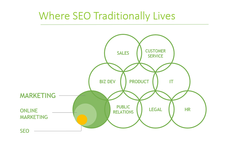 不幸的是,在大多数企业中,搜索数据只被搜索和数字团队使用,甚至大多数SEO团队和他们的数据只是传统地存在于市场营销范畴内的网络营销中,结构图如下:
