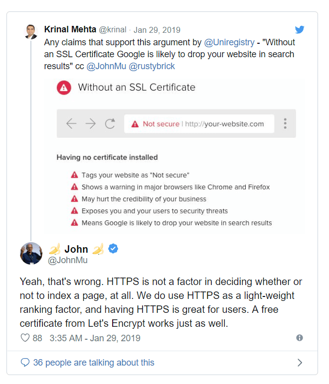 搜索引擎表示,HTTPS是影响排名因素之一。约翰·穆勒(John Mueller)证实了这一点。