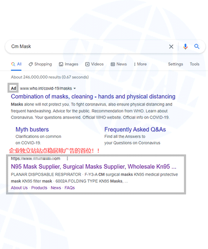 区别于第三方平台的展示作用,独立站打造的是私域流量,需要对网站进行一个明确的定位,并在推广关键词的选择上,有明确的策略与方向。“面对企业内部加班加点的生产,以及口罩原料供应商的上下链对接,如何在一个全新的渠道上,绕开弯路,直达营销目的,全球搜的专业服务给予了我们很大的帮助”朝美负责人林彦伟分享道。在双方的共同努力下,在短短一个月的时间内,一个全新的外贸营销型口罩类目独立站正式上线!