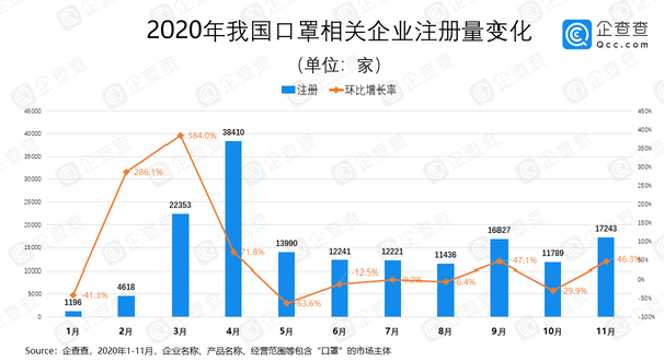 据企查查数据显示,2020年口罩企业注册量比历年数据总和还多,换算下来,相当于平均每3分钟就新增一家口罩企业。