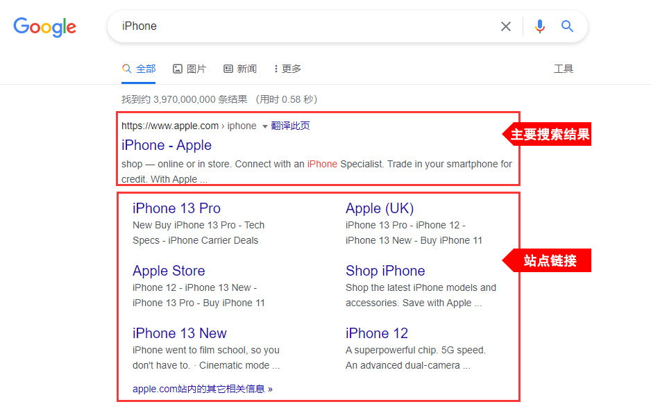 如下图,在搜索“iPhone”关键词时,这说明站点“https://www.apple.com”获得了Google Sitelinks: