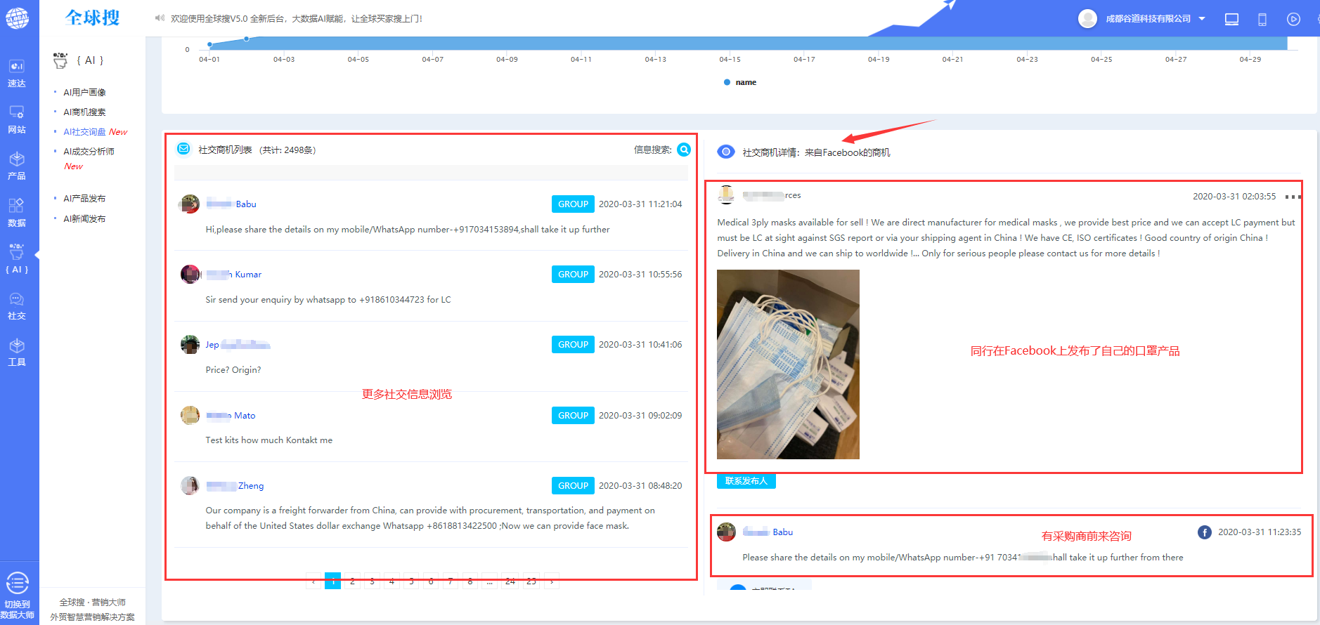 整合了各大社交平台的信息,只要你输入关键词,就可以查询到与该关键词相关的所有社交询盘(包括评论,帖子),让你在第一时间,与意愿采购者取得联系。