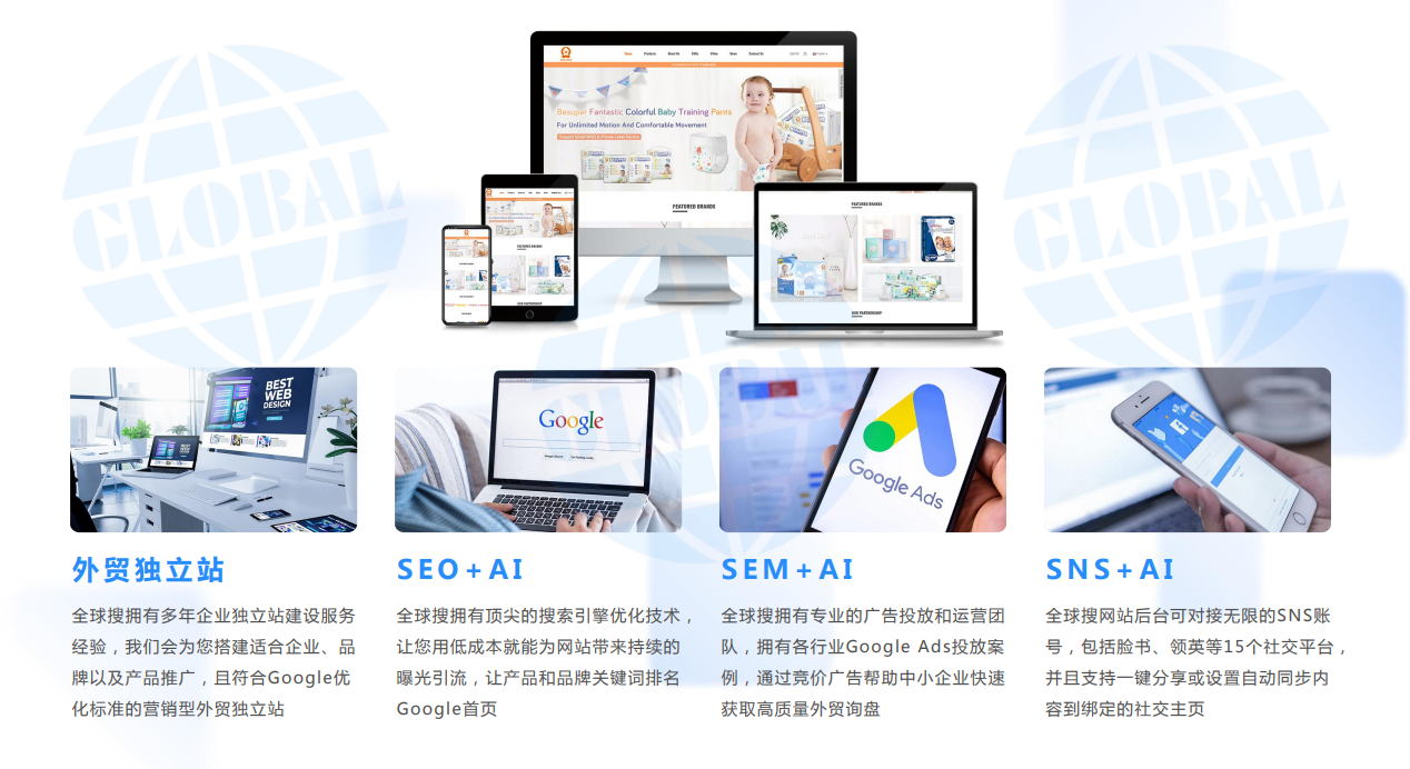 全球搜作为谷歌官方核心合作伙伴,致力于打造高转化率的营销型外贸独立站,为品牌曝光引流,提升企业信赖感,为企业提供多元、高效、高转化的外贸营销解决方案。