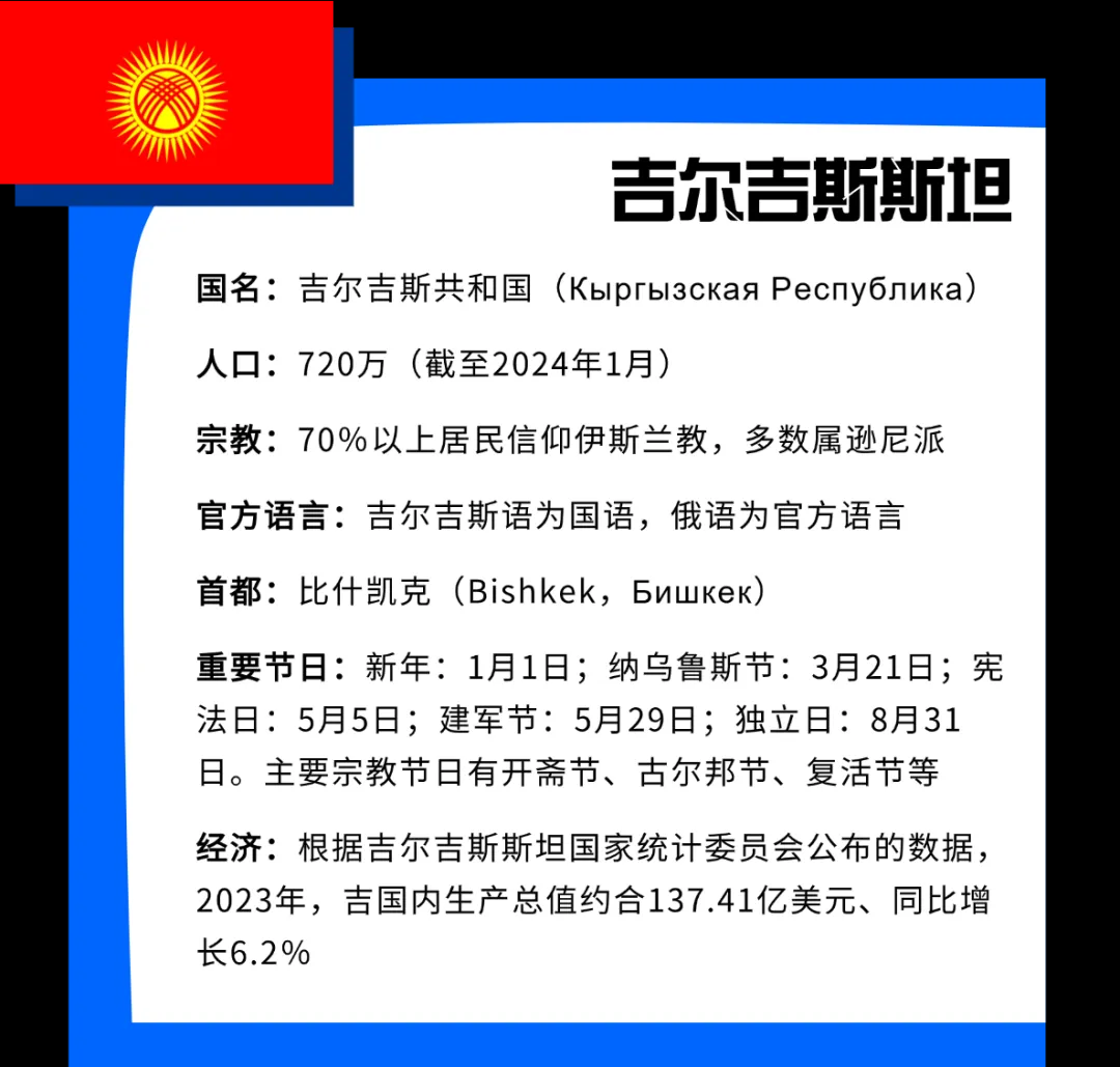 吉尔吉斯斯坦是古丝绸之路的重要枢纽,是连接欧亚的重要通道,对乌兹别克斯坦、哈萨克斯坦、塔吉克斯坦等中亚邻国辐射作用明显,中国出口到吉尔吉斯斯坦的产品约70%转口至中亚邻国。