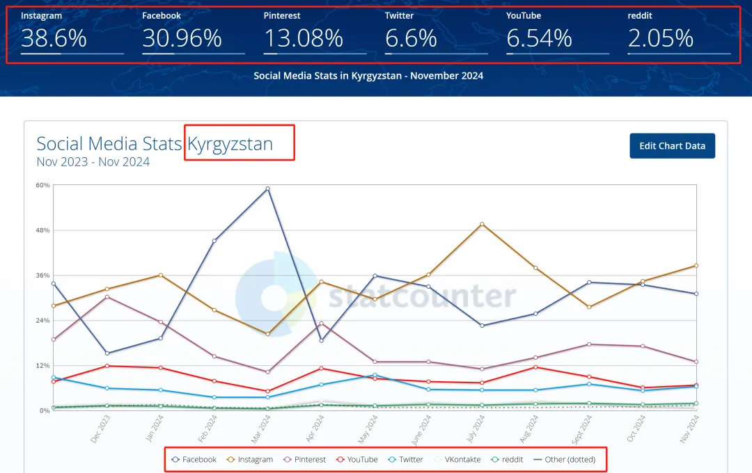 Statcounter数据显示,吉尔吉斯斯坦主要使用Facebook、Instagram等社交平台,同时还需注意TikTok。七麦数据显示目前吉尔吉斯斯坦下载量前10位的社交APP有Threads、Telegram、WhatsApp、Facebook、小红书、VK、WeChat。