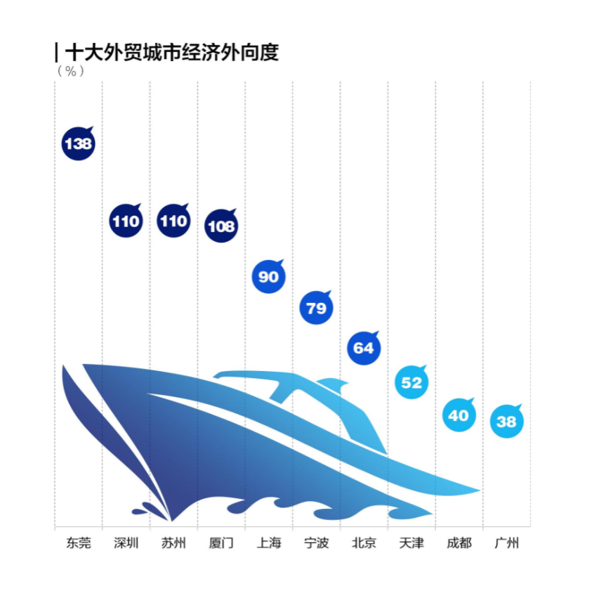 十大外贸城市中,东莞、深圳、苏州和厦门的经济外向度最高,均超过100%,其中东莞经济外向度达138%,深圳、苏州和厦门分别为110%、110%和108%。