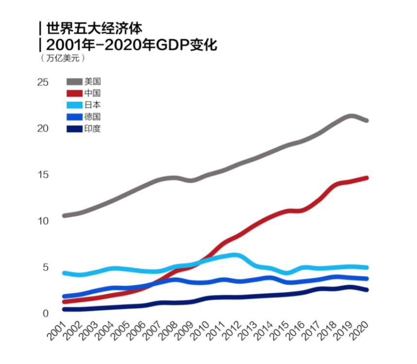 1)加入WTO20年以来,中国已成为世界第二大经济体。经济总量由2001年的11.1万亿元增至2020年的101.6万亿元,共增长8倍,占世界比重由4%增至17.4%。