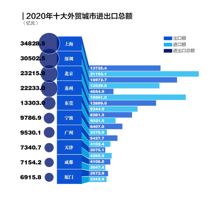 全球新冠疫情影响下,尽管面对前所未有的困难和挑战,我国外贸进出口仍逆势增长,2020年全年货物进出口总额32.15万亿元,比上年增长1.9%。“入世”这20年里,中国不少城市成为全球贸易的“重要一环”。2020年外贸进出口总量排名前十的城市分别是上海、深圳、北京、苏州、东莞、宁波、广州、天津、成都和厦门。