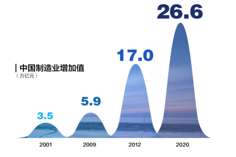过去20年里,中国制造业增加值由2001年的3.5万亿元增至2020年的26.6万亿元,共增长7倍,占世界比重由7.4%增至近30%,在2010年后稳居世界第一。