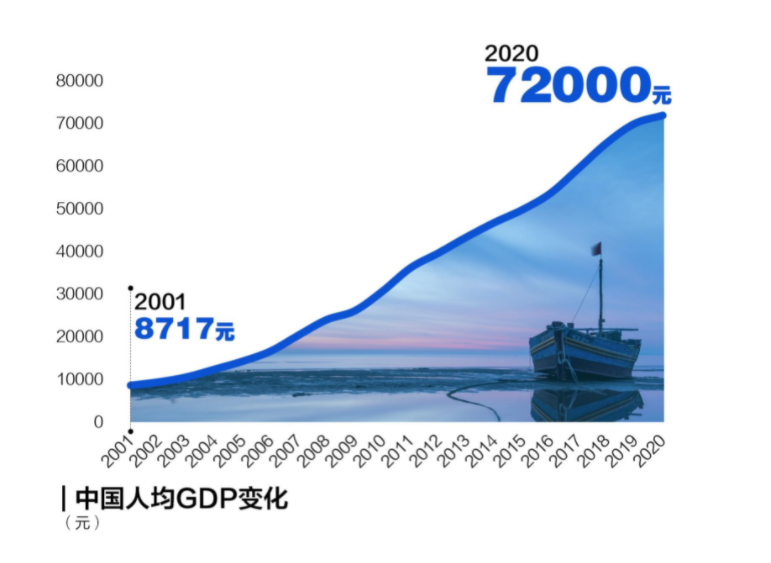 加入WTO之后,中国加速融入全球贸易体系,人民生活质量显著提高,人均GDP从2001年的8717元增至2020年的7.2万元,共增长7倍。