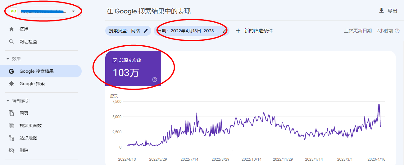 1、SEO优化一年左右,网站曝光量高达103万次!并且持续呈上升趋势!