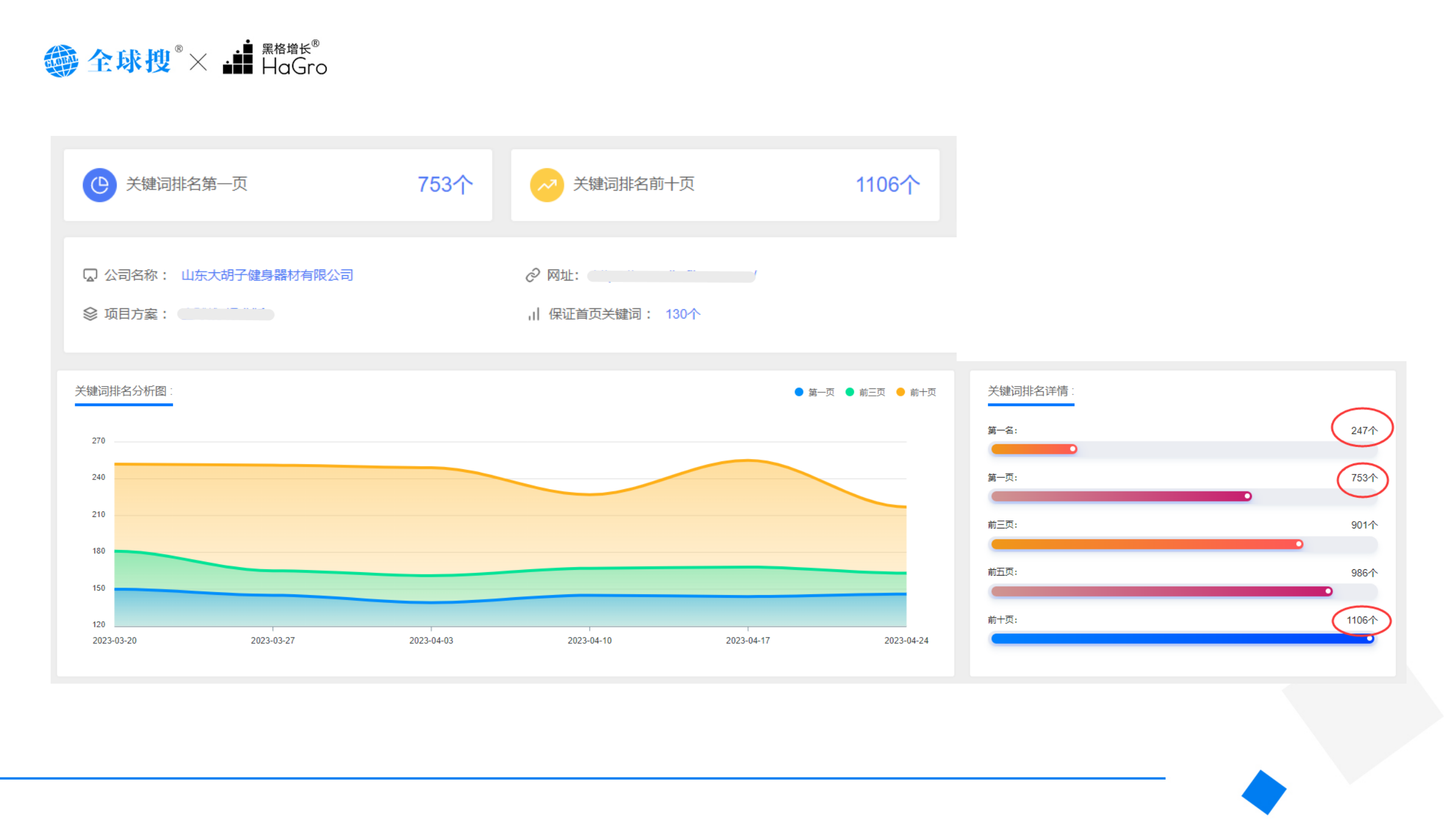 1、网站在Google首页达标关键词753个,首页第一名关键词达到247个!