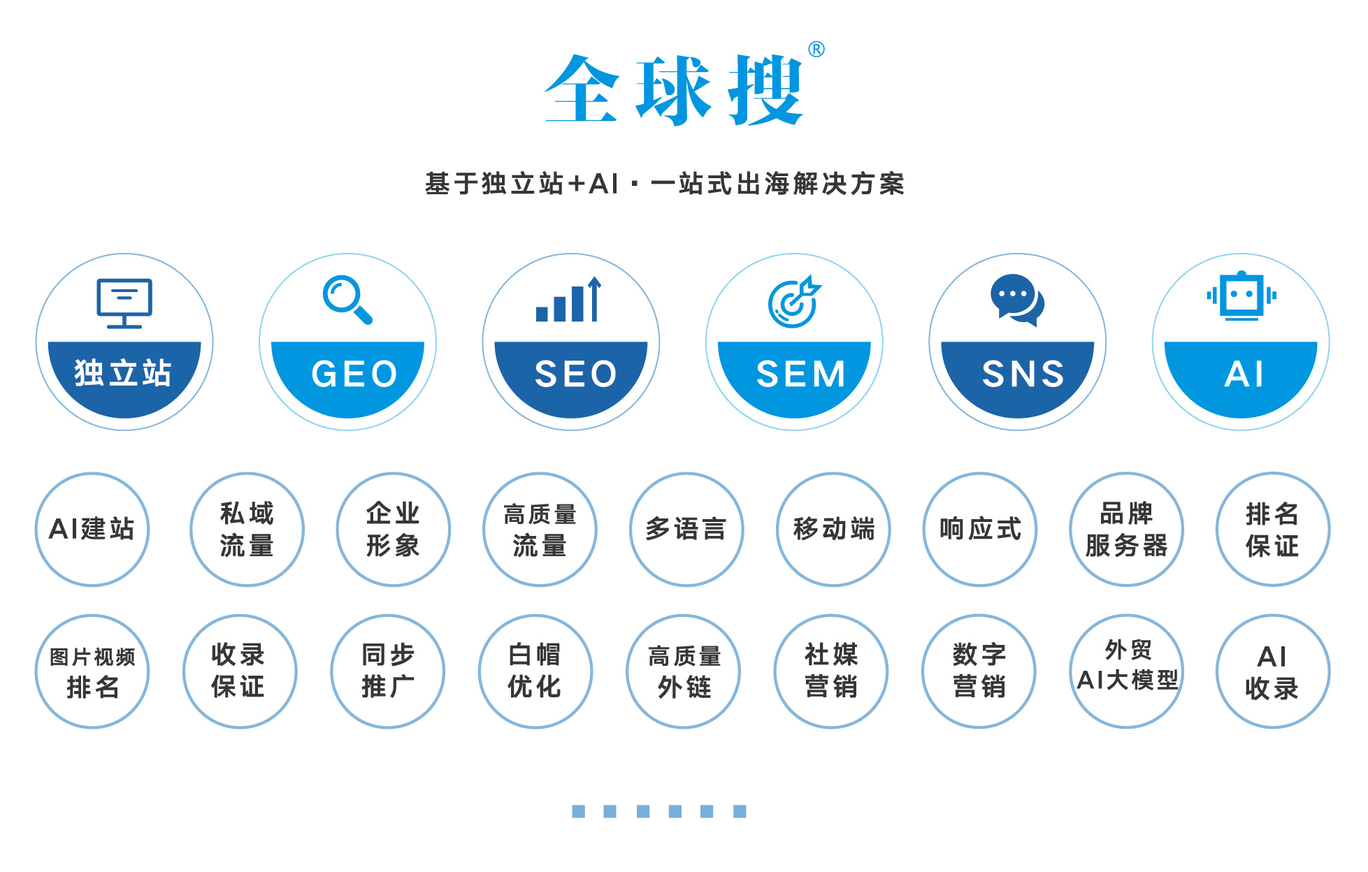 全球搜是以软件开发平台架构为基础进行外贸建站、以谷歌搜索引擎为核心进行优化推广的独立站+AI一站式出海解决方案!
