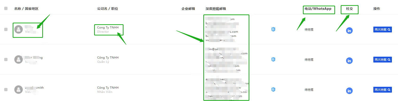 几秒内(公司数据越多耗时越长)就能获取所选企业的决策人信息,包括姓名、职位、邮箱、电话、社交账号等等。