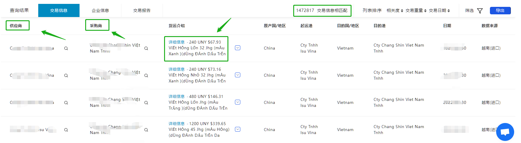 可以看到最近的供应商(竞争对手),采购商(潜在客户),还有过境时的产品信息,方便后续开发客户时有一个价格参考。