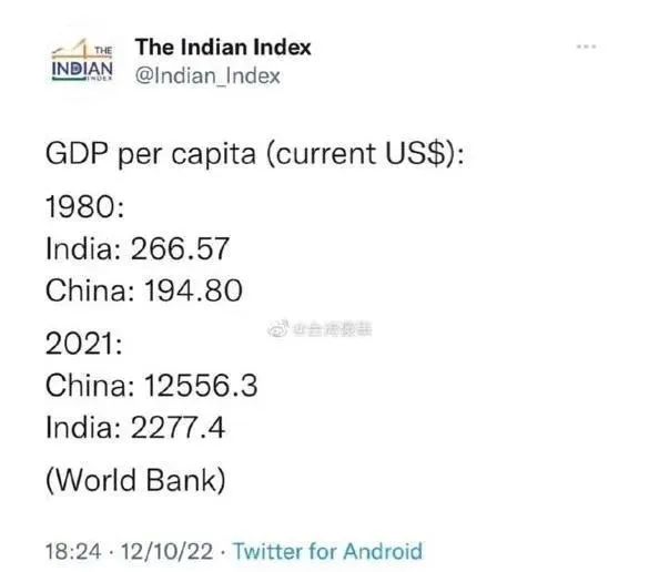 根据世界银行数据显示,1980年,中国人均GDP仅有194.8,而印度为266.57。