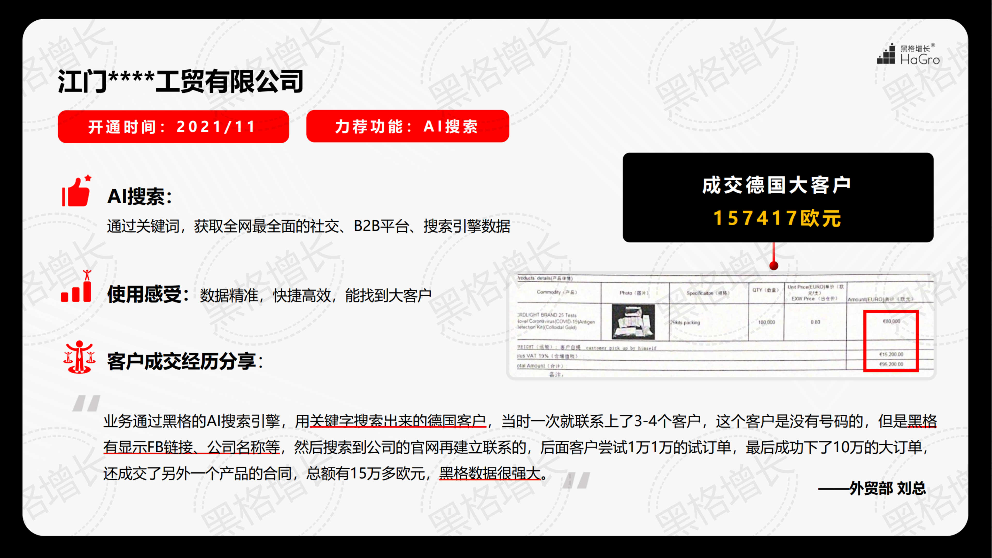 从产品技术的提升,最大化发挥大数据与AI的作用,到服务质量的改进,黑格增长细节的改变不断提高了黑格用户实际的体验,由此更能直观地体现在外贸企业的成单记录里,助力外贸企业稳中向前的开拓海外。