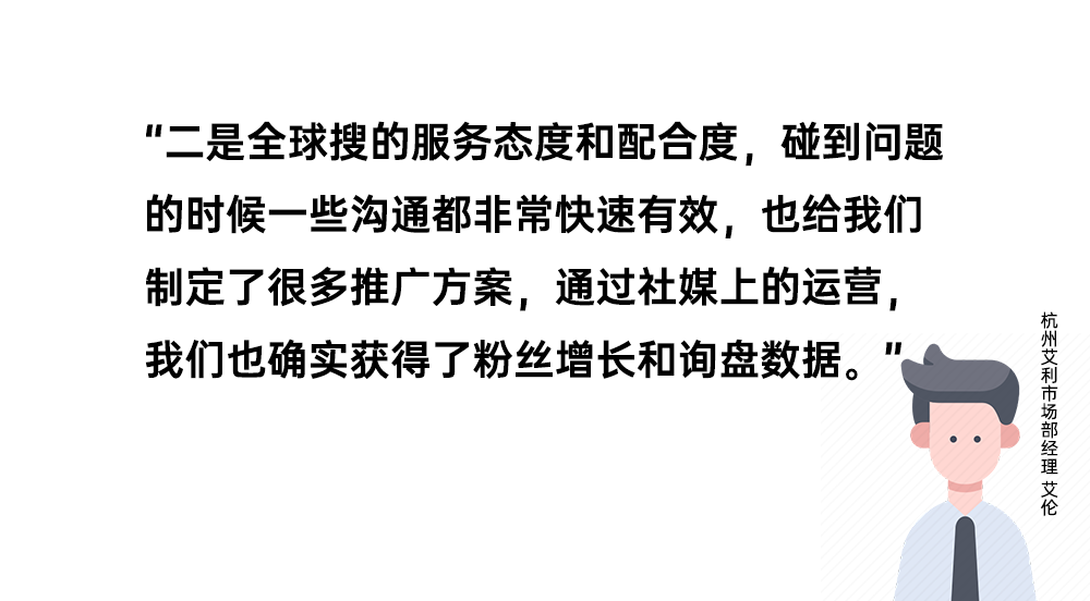 “二是全球搜的服务态度和配合度,碰到问题的时候一些沟通都非常快速有效,也给我们制定了很多推广方案,通过社媒上的运营,我们也确实获得了粉丝增长和询盘数据。”艾伦说道。