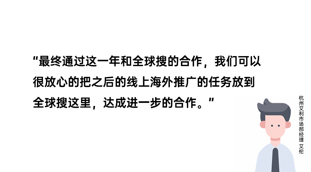 “最终通过这一年和全球搜的合作,我们可以很放心的把之后的线上海外推广的任务放到全球搜这里,达成进一步的合作。”艾伦说道。