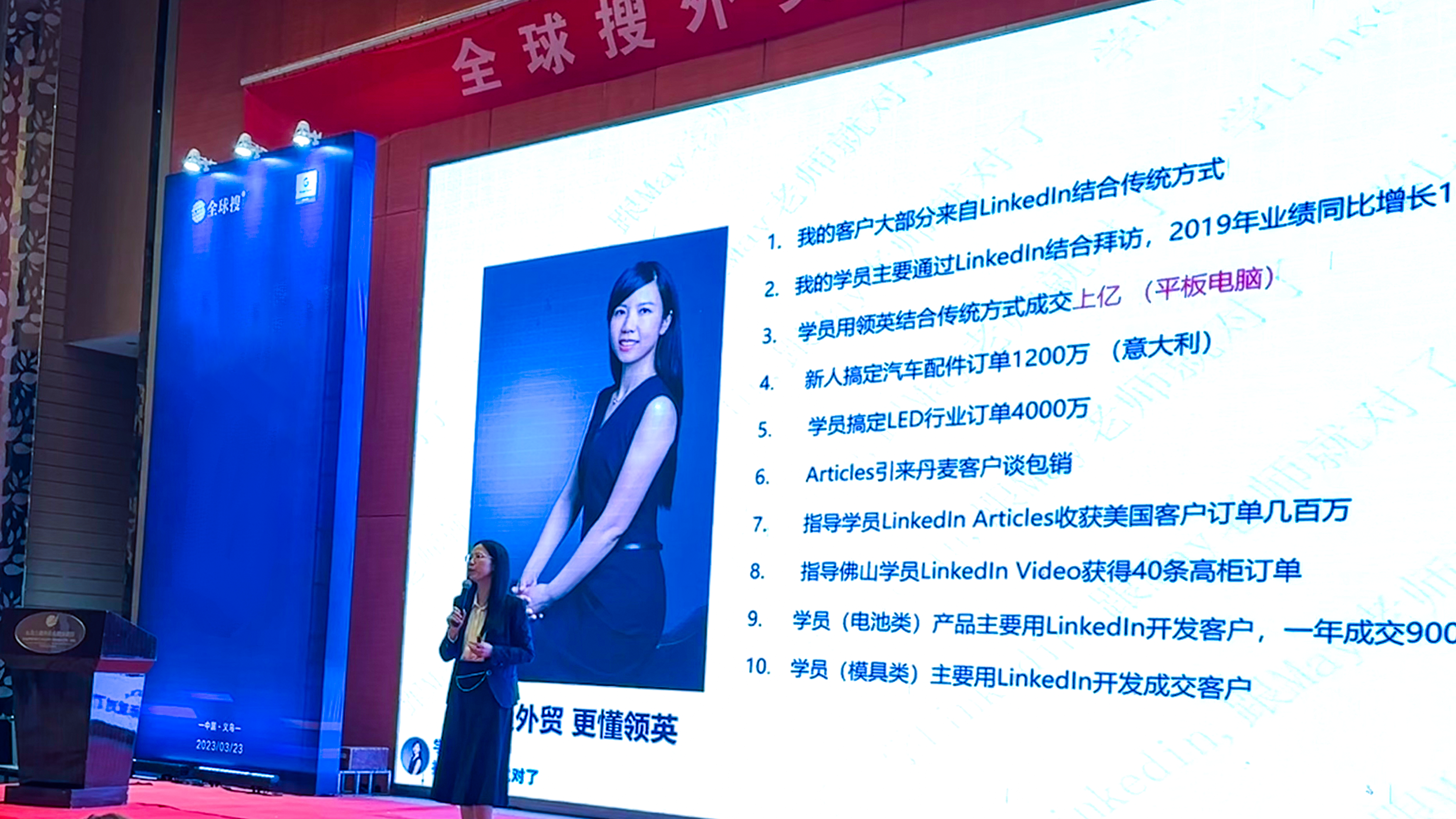 在义乌站,国内领英TOP1实战派讲师May老师则用她十多年丰富的专业经验,倾情分享了如何运用LinkedIn零成本开发大客户、开大单。在现场,May老师通过对LinkedIn的底层逻辑分析,营销原理层层递进,多维度地为在场的外贸企业家们分享了一份宝贵可行的LinkedIn线上获客解决答卷。