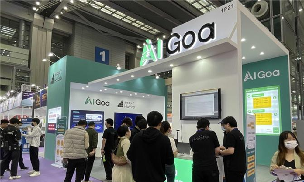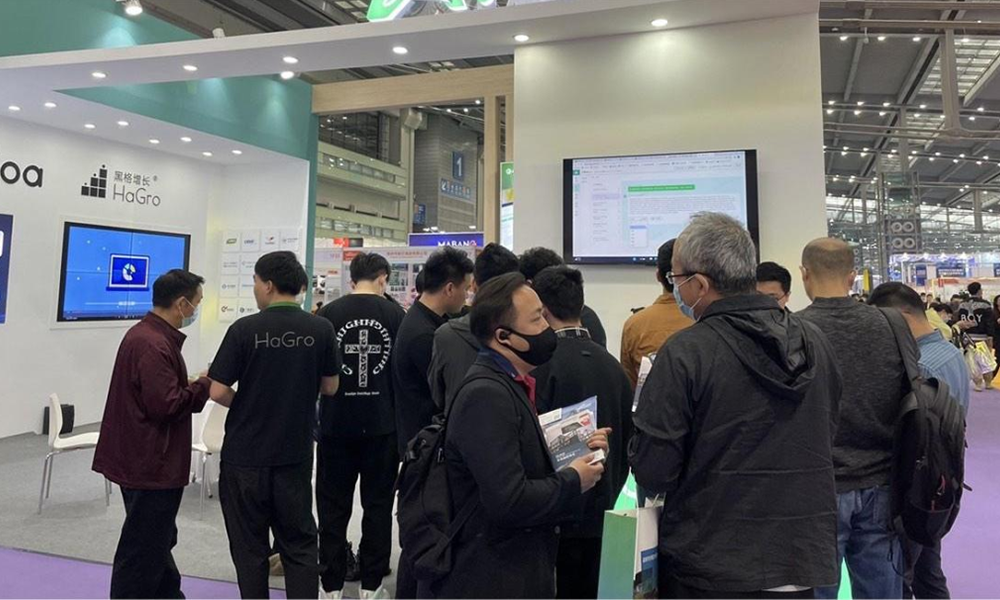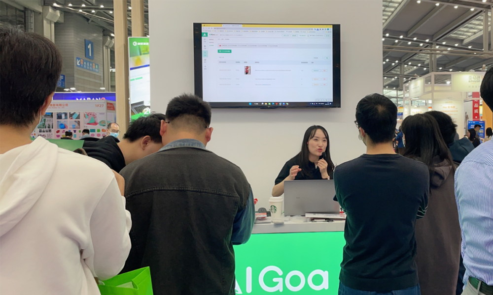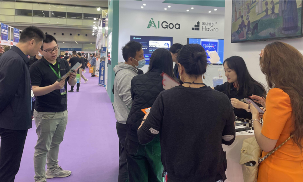 展位现场聚集了大量前来咨询和了解的参展观众,大家都驻足在展区前观看产品演示视频,并且主动扫码关注品牌公众号,了解更多有关黑格增长和AIGoa的功能和情况。