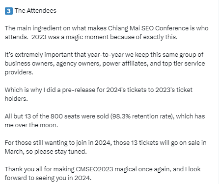 疫情时隔三年,Chiang Mai Seo Conference: 简称CMSC,再次召开。全球SEO大会,这是目前世界上最大规模的以SEO为核心的大会,也是东南亚顶级搜索引擎优化企业家的年度盛会。