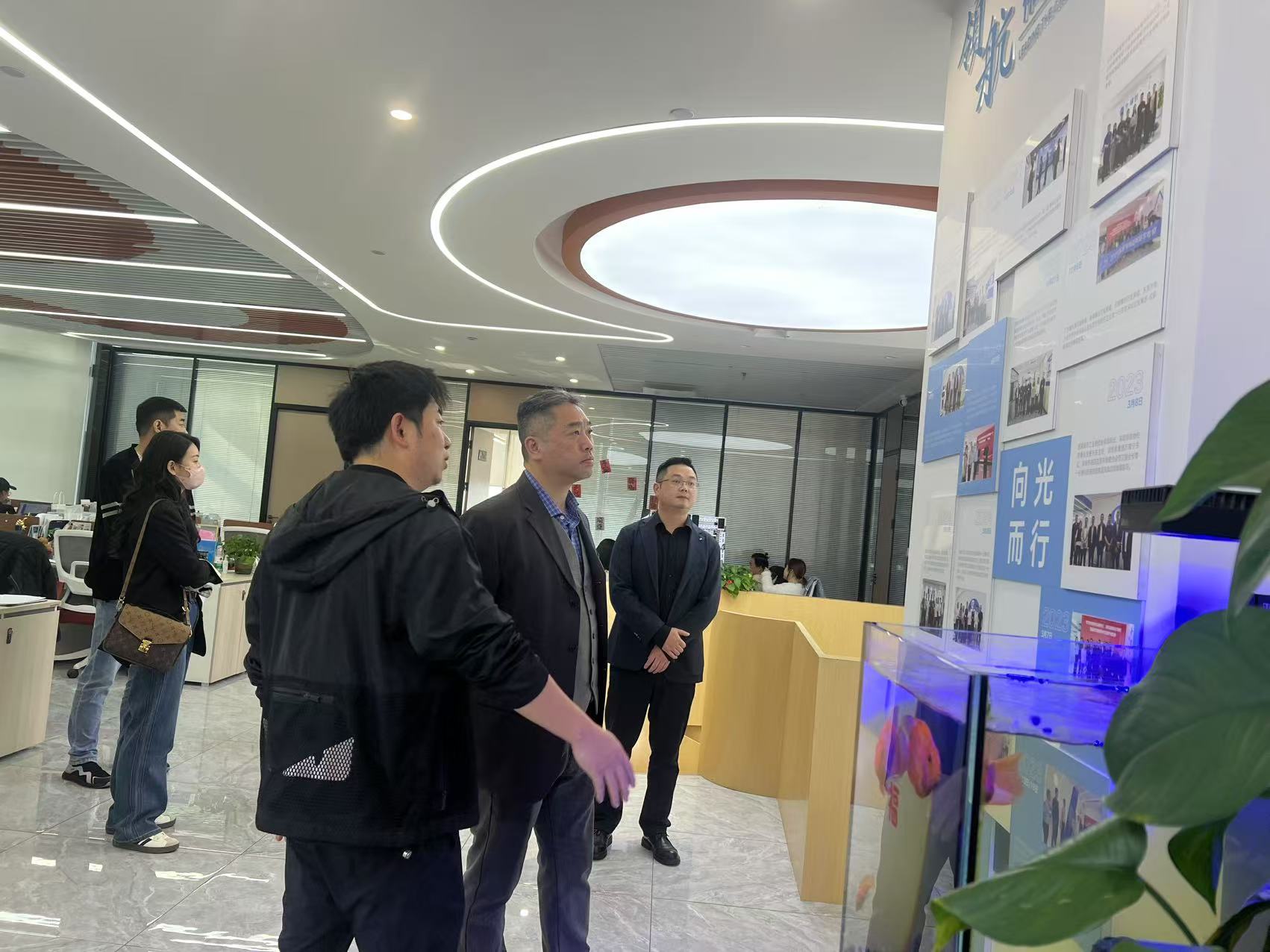 钟建生局长一行首先参观了创贸集团的企业风貌与成果展示区,详细了解了企业在 AI 营销、大数据分析、外贸服务等领域的创新应用。