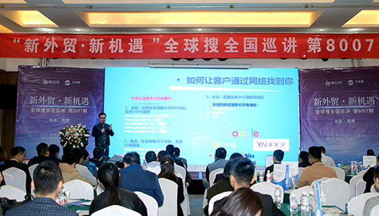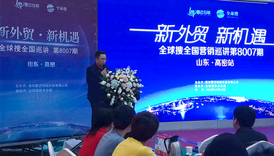 10月19日,“新外贸·新机遇”全球搜全国巡讲第8007期主题宣讲活动在山东省高密市凤都国际大酒店成功举办。本次巡讲由全球搜技术总部主办、潍坊雷迈网络科技有限公司承办,与会商户50余家。