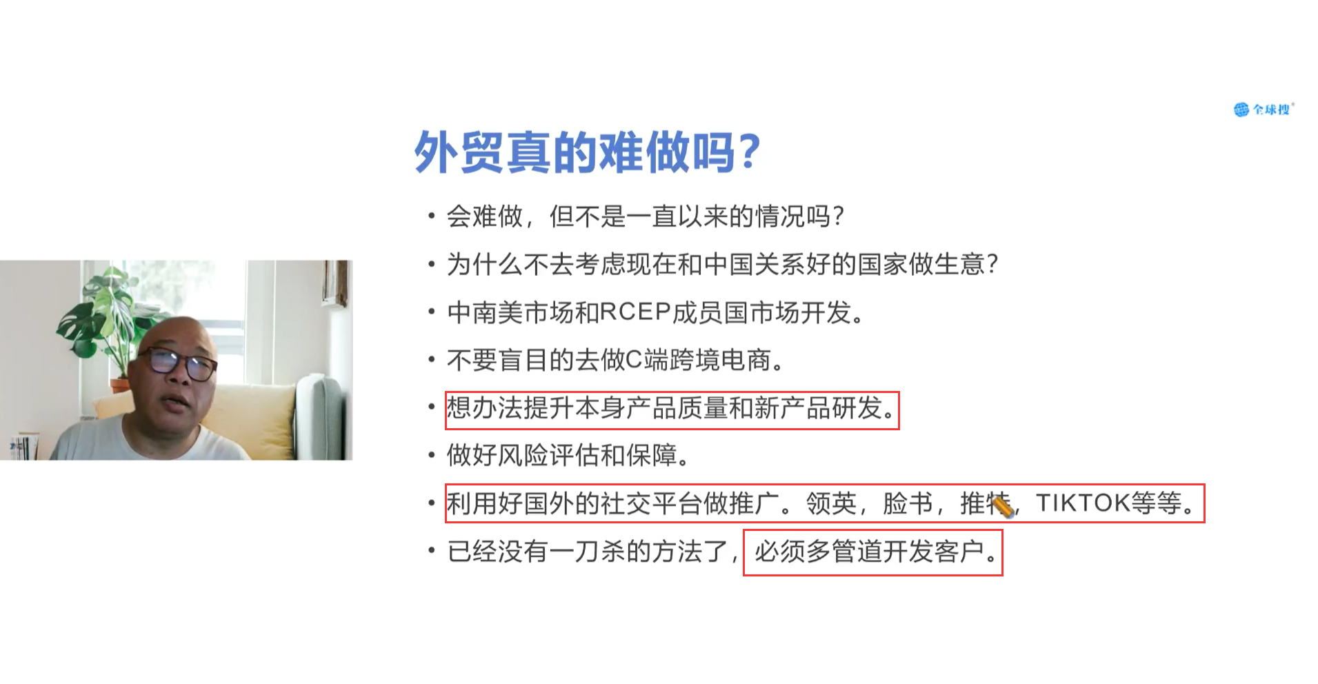 2022年7月7日,全球搜特邀外贸营销专家——安东尼老师,为大家带来了国际大环境对外贸业务造成的影响及解决办法,用身经百战的成功经验为外贸企业排雷。