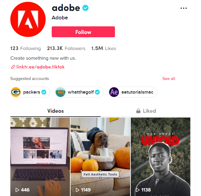 Adobe,美国一家跨国电脑软件公司,在TikTok上,5月只有7.6k粉丝,而目前已经有213.3k。