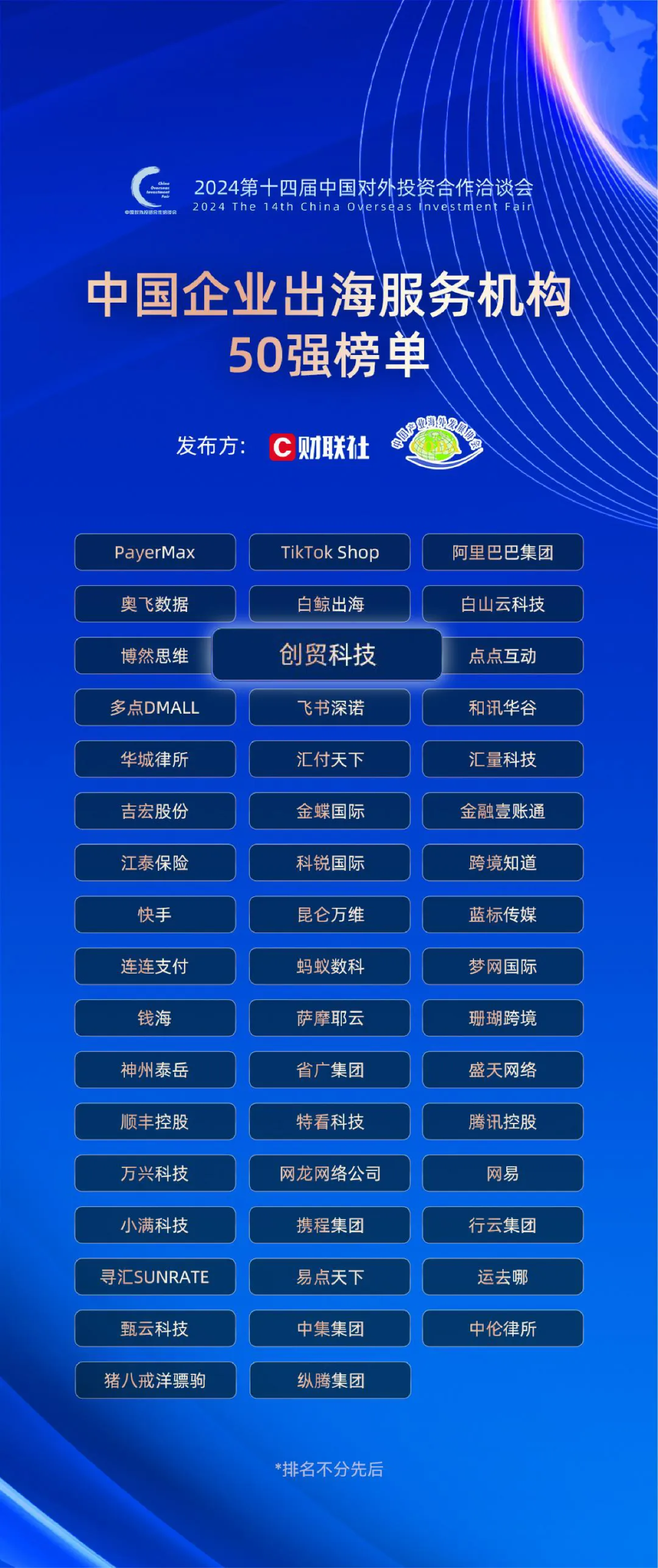 5月28日,中海协与财联社联合评选的“中国企业出海服务机构50强”于第十四届中国对外投资合作洽谈会期间正式发布,创贸集团与TikTok Shop、阿里巴巴集团、腾讯控股等企业入选,代表了中海协等行业权威机构对获奖企业的认可。