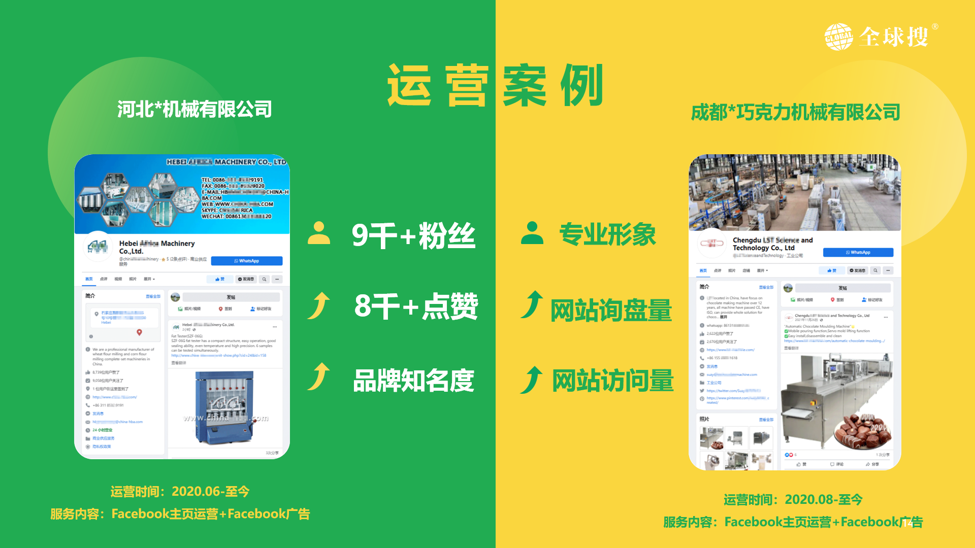 针对Facebook外贸营销,全球搜也推出了Facebook运营营销方案以及Facebook获客增长方案。