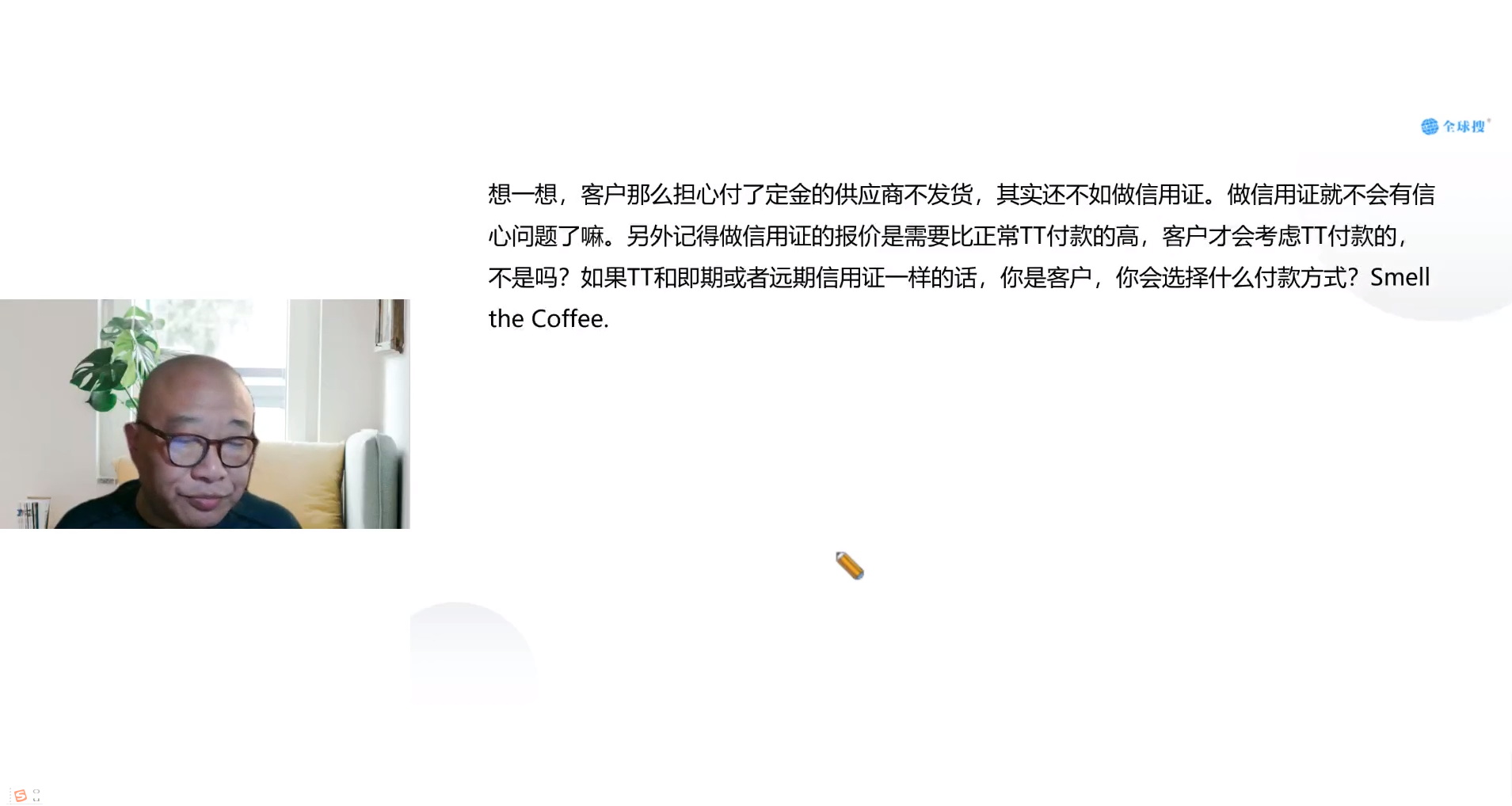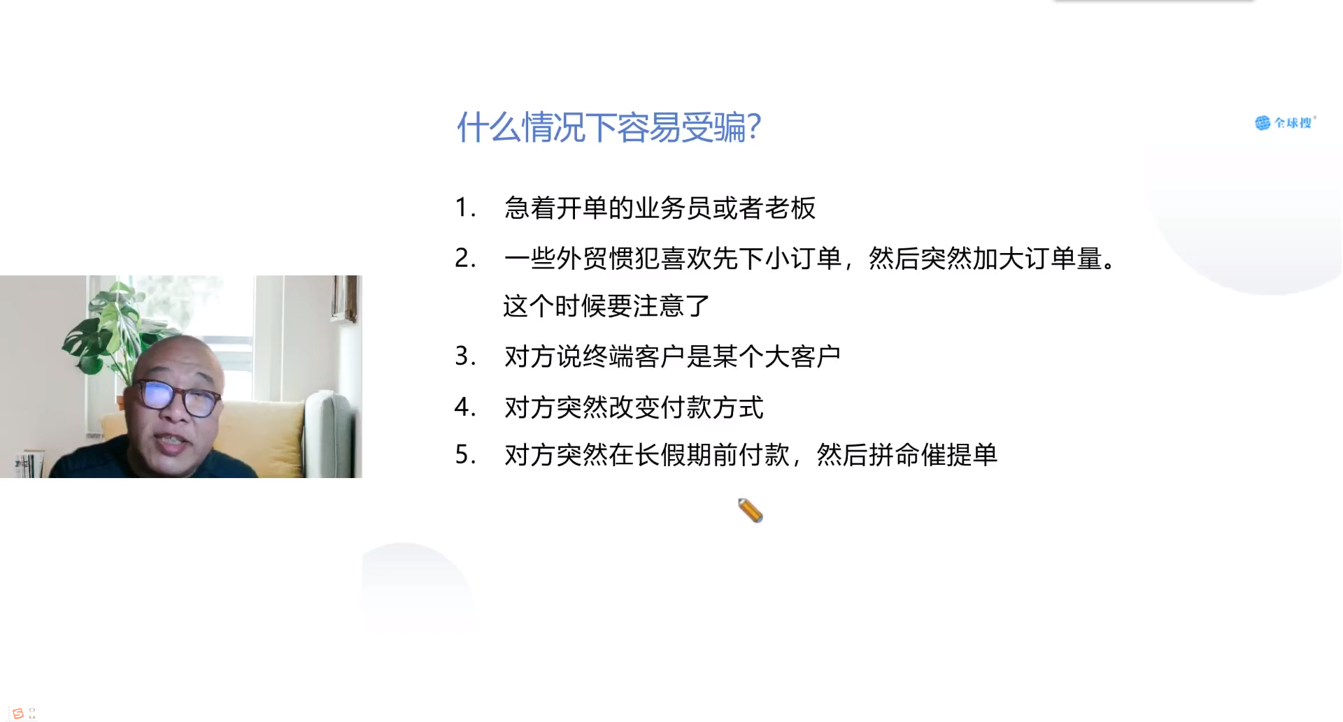 2022年05月2日,全球搜特邀外贸实战专家——安东尼老师为大家讲解如何制定外贸企业防骗预防策略!