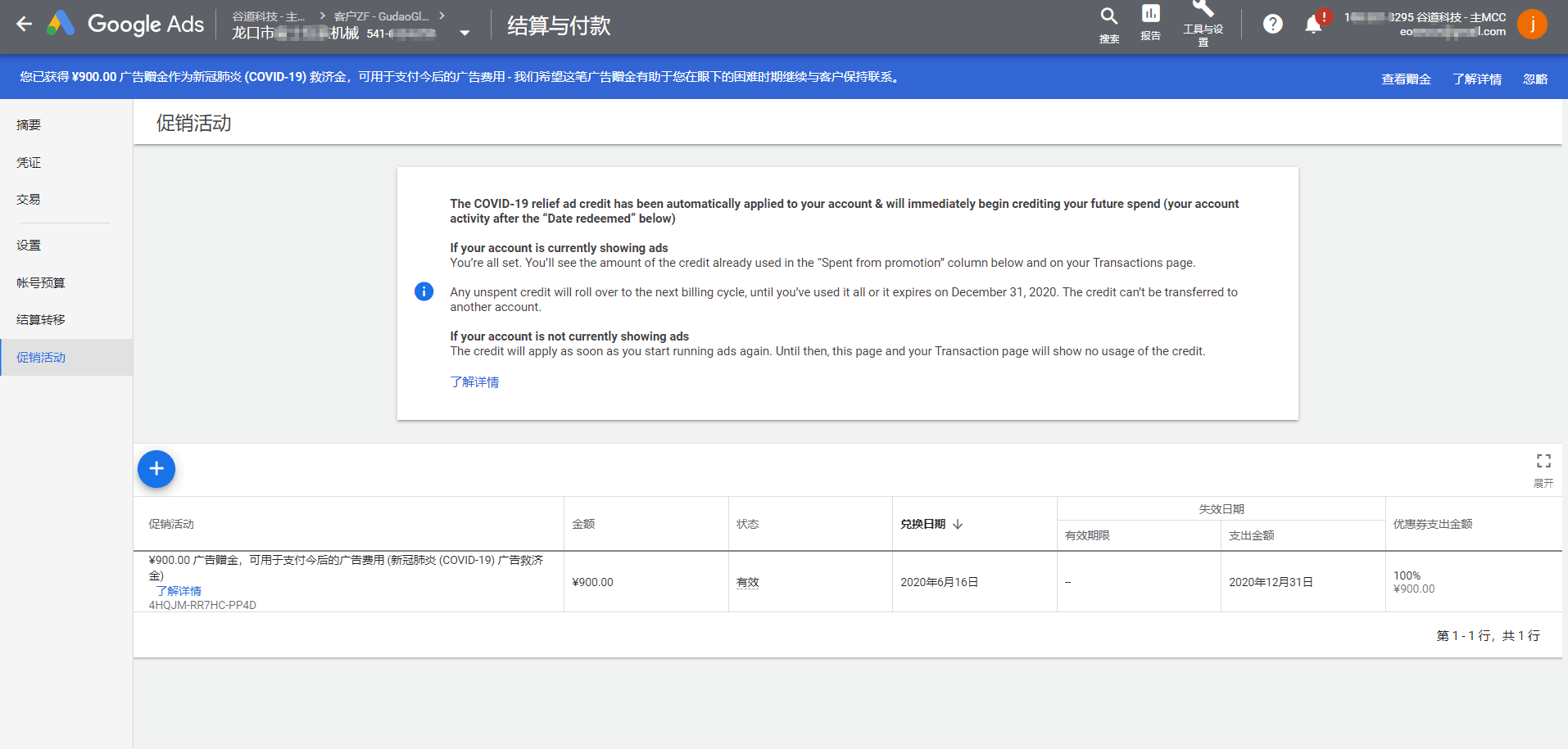这是为了减缓此次疫情对广大企业的经济影响,广告赠金会自动下发于Google广告帐户中的“促销”标签,有效期至2020年12月31日。