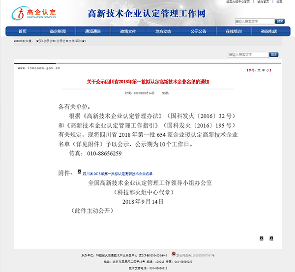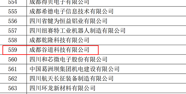 2018年9月14日,全国高新技术企业认定管理工作领导小组办公室将四川省2018年第一批654家企业拟认定高新技术企业名单予以公示,成都谷道科技有限公司荣登榜位。