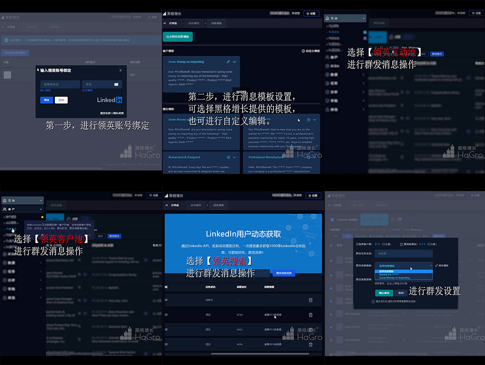 【领英群发】,通过对行业内领英会员进行消息群发。众所周知,通过领英开发客户,只能进行一对一的消息发送,无法实现消息群发,而HaGro【黑格增长】的【领英群发】功能便为外贸企业创建了群发消息的接口,帮助企业更好地实现自动化营销。