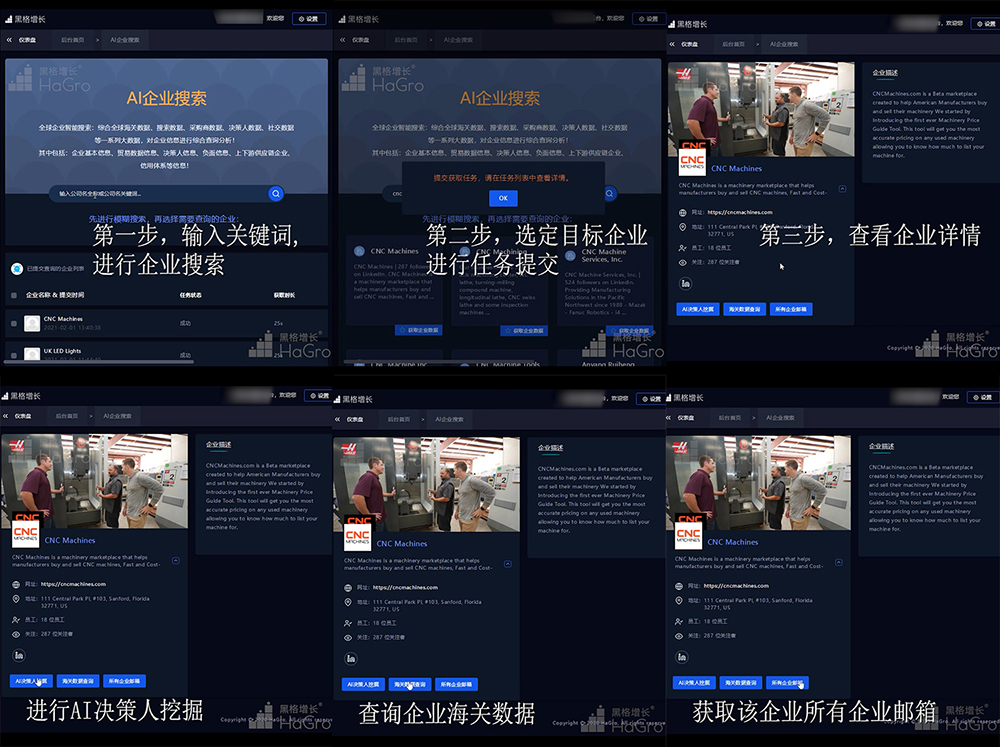 同时,HaGro【黑格增长】建立了【AI决策人挖掘】、【海关数据查询】、【所有企业邮箱搜索】三大功能的跳转接口,可以直接对该企业的采购决策人进行挖掘、对该企业的海关数据进行查询,并可直接搜索该企业的所有企业邮箱。