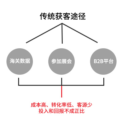 传统的获客途径无非就是购买海关数据、线下参加展会、查找B2B平台数据,或者投入大量的精力在各大社交平台上进行广告投放,从而引起客户注意,收到客户的询盘。