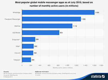 WhatsApp作为Facebook旗下的即时通讯服务平台,在全球范围内活跃用户数量已超过20亿,成为活跃用户数量仅次于Facebook的线上沟通渠道,据2019年数据显示,每天通过WhatsApp发送的消息超过650亿条。
