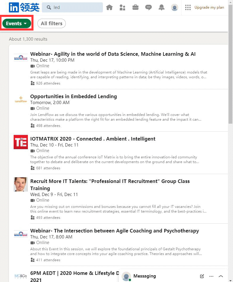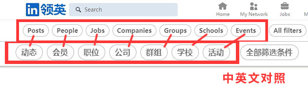 其他的筛选功能同样可以提高普通用户在LinkedIn上搜索客户的效率。不过,值得注意的是Events功能筛选出来的是与关键词相关的活动,People功能筛选的是LinkedIn会员,普通用户无法进行查看,Groups功能会受到地区限制,在中国区的用户无法使用。