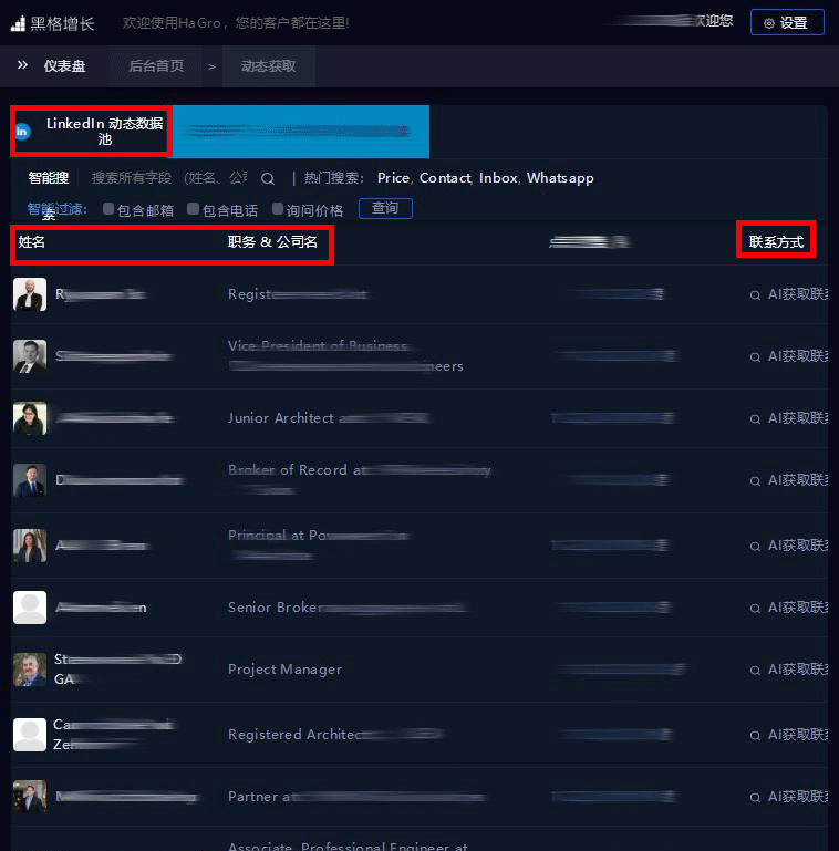 别担心,作为“LinkedIn初级玩家”的你,定位到想要的潜在客户就够了!接下来,你需要转移战场,使用HaGro【黑格增长】!