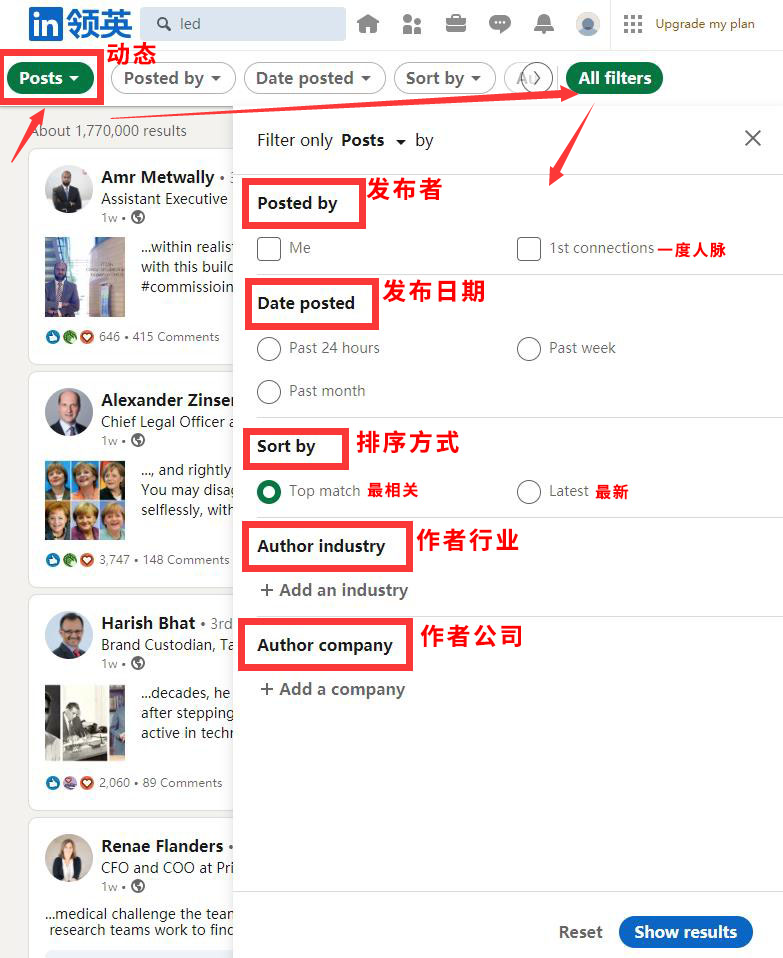 通过搜索关键词,选择Posts(动态)筛选,获取LinkedIn上与关键词相关的最新、最热的动态帖子,通过进一步的筛选条件,匹配精准的动态帖子,寻找LinkedIn上行业活跃用户,洞察行业讨论的热点,分析活跃用户对相关行业的需求。(tips:可以点击动态帖子查看详情)