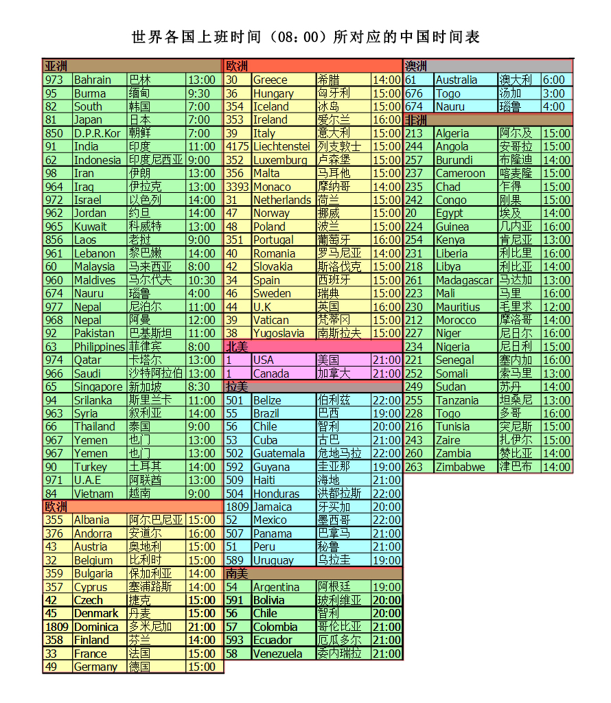 下面是一份关于世界各国客户(主要国家)上班时间(以8:00上班为准)在中国的时间对应表,建议收藏!