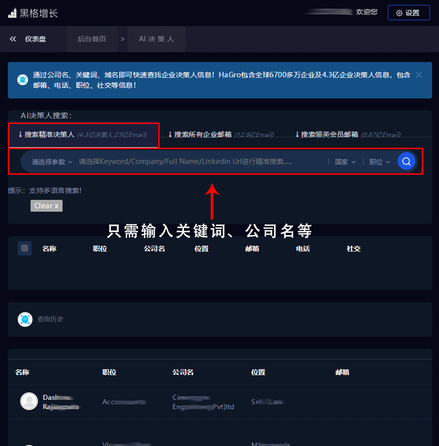 通过WhatsApp功能找到该客户社交主页上留下的信息,如企业名、企业网址、企业邮箱等,再用这些信息通过黑格增长的【AI决策人】功能挖掘该客户所在企业的采购决策人及联系方式、所有企业邮箱等联系信息。