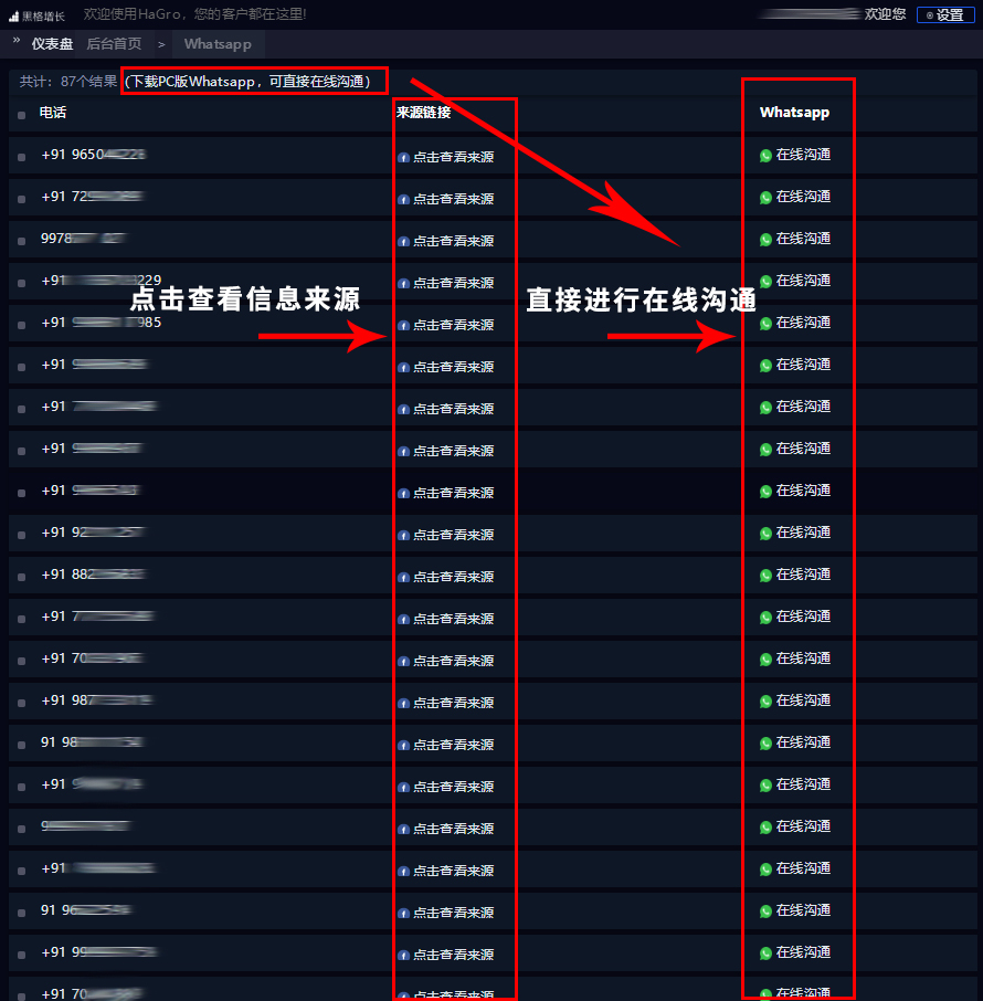 只需几秒钟的时间,便可以直接获得该区域内相关社交平台上公开的所有WhatsApp电话号码,同时可以通过HaGro【黑格增长】搭建的接口,查看具体的信息来源,查看客户在社交平台上的动态,了解客户更多的信息,并进行客户开发价值判断。在确定潜客后直接通过HaGro【黑格增长】搭建的WhatsApp在线沟通功能,与潜在客户进行在线沟通,以及进行消息群发。